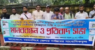 স্টাফ রিপোর্টার: সাংবাদিক মামুনুর রশীদ মামুনের গ্রামের বাড়ীতে হামলা লুটপাটের ঘটনার প্রতিবাদে ময়মনসিংহ সাংবাদিকবৃন্দের আয়োজনে মঙ্গলবার ১১জুলাই সকাল ১১:৩০ টার সময় বিভাগীয় কমিশনার কার্যালয়ের সম্মুখে মানববন্ধন ও প্রতিবাদ সভা অনুষ্ঠিত হয়। উক্ত মানববন্ধনে সভাপতিত্ব করেন, বাংলাদেশ মফস্বল সাংবাদিক ইউনিয়ন, কেন্দ্রীয় সাধারন সম্পাদক শিবলী সাদিক খান, বক্তব্য রাখেন বাংলাদেশ তৃণমূল সাংবাদিক …
